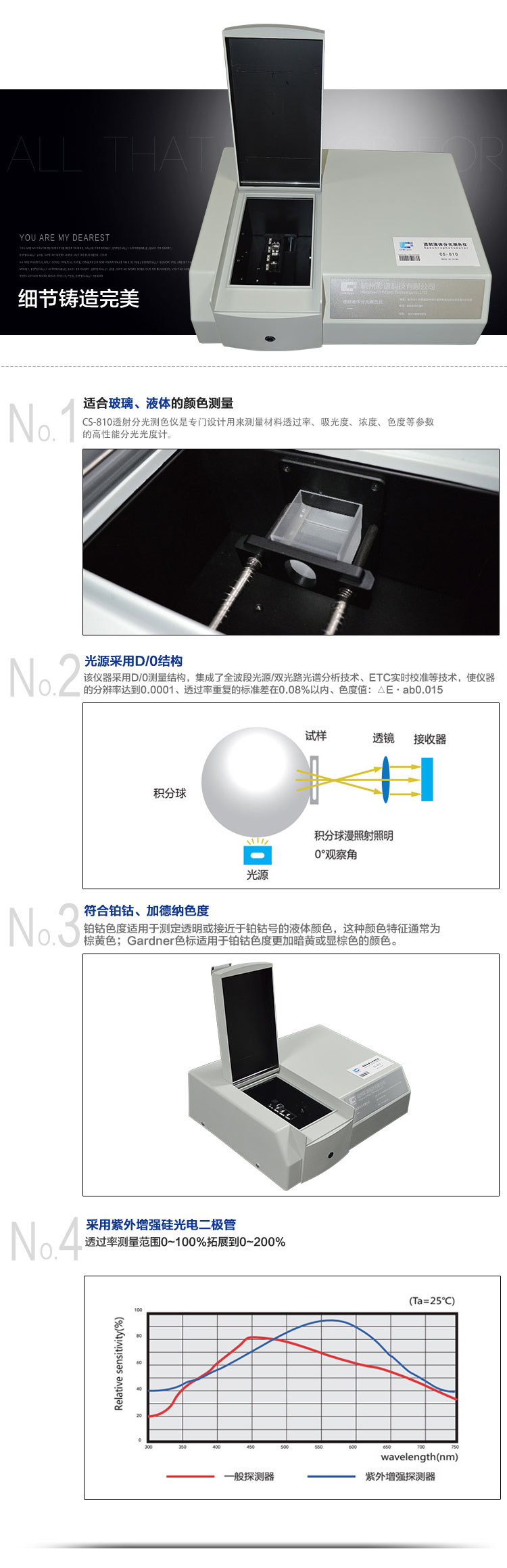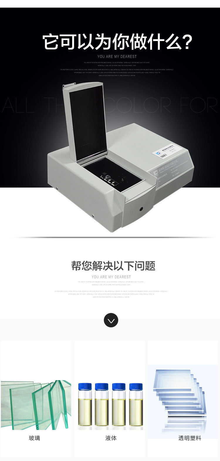 專門設計用來測量液體透過率、吸光度、濃度、色度等參數的高性能分光儀。可測水質鉑鈷色,適合玻璃、液體顏色測量