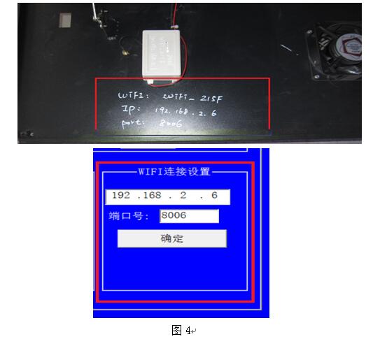 如果是第一次調試或使用軟件,建議檢查WIFI的IP地址和端口號設置是否正確,在“系統設置”對話框內,有“WIFI連接設置”項,框內有IP和端口號的信息,在設備的前面板打開后,有此車轍儀的相關信息(見圖4),如果對應就是設置正確。