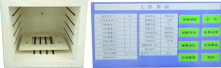 ⑹ 裝好混合料后,如果此時“過濾室溫度”顯示大于600度時,將料筐放在燃燒爐內的托盤上,一定要將料筐放置在托盤的中央,才能確保試驗結果的準確性。